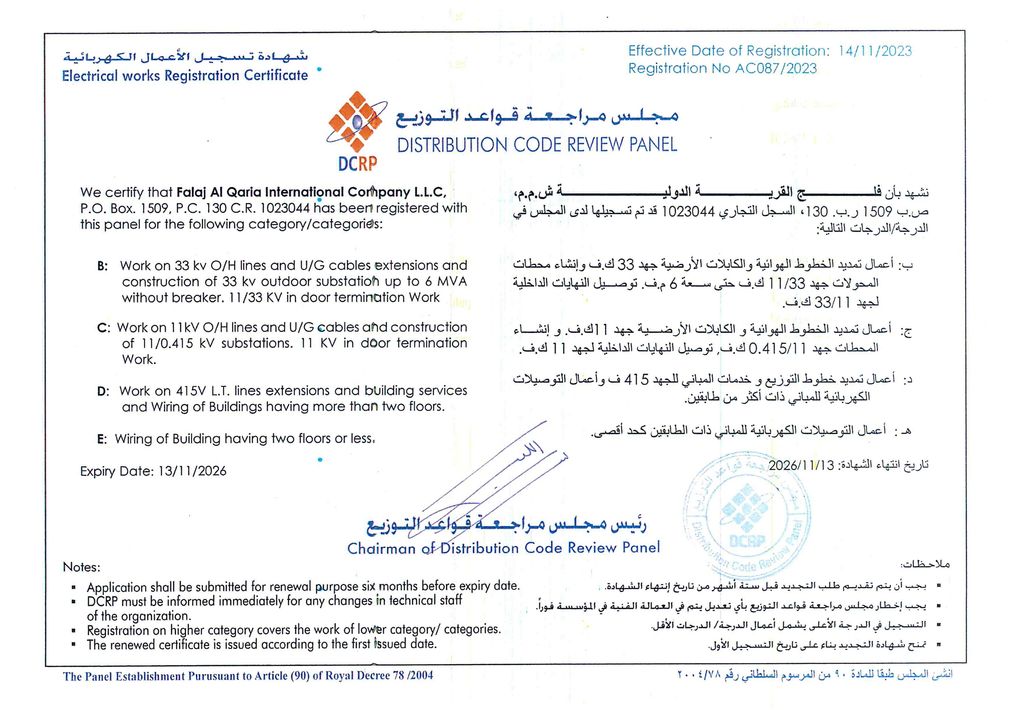 Falaj Al Qaria International Co. LLC (FAQC) is a DCRP ‘B’ grade electrical and civil contracting company with 17+ years of experience in Oman, delivering reliable electrical solutions across diverse projects.